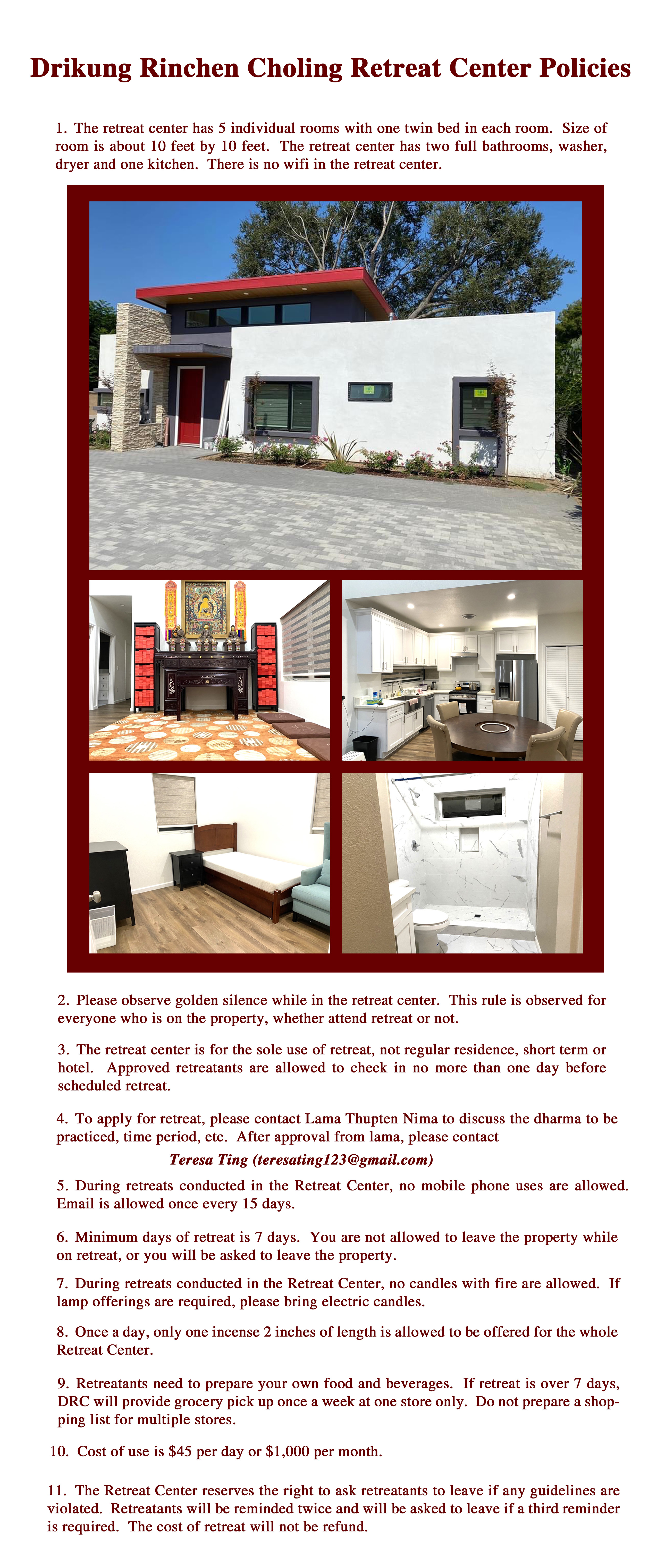 Drikung Rinchen Choling (DRC) is H.E. the 8th Garchen Rinpoche's main Dharma Center in southern California. It provides a place for students to practice daily and for short term retreats under the guidance of H.E. Garchen Rinpoche and Ven. Lama Thupten Nima.